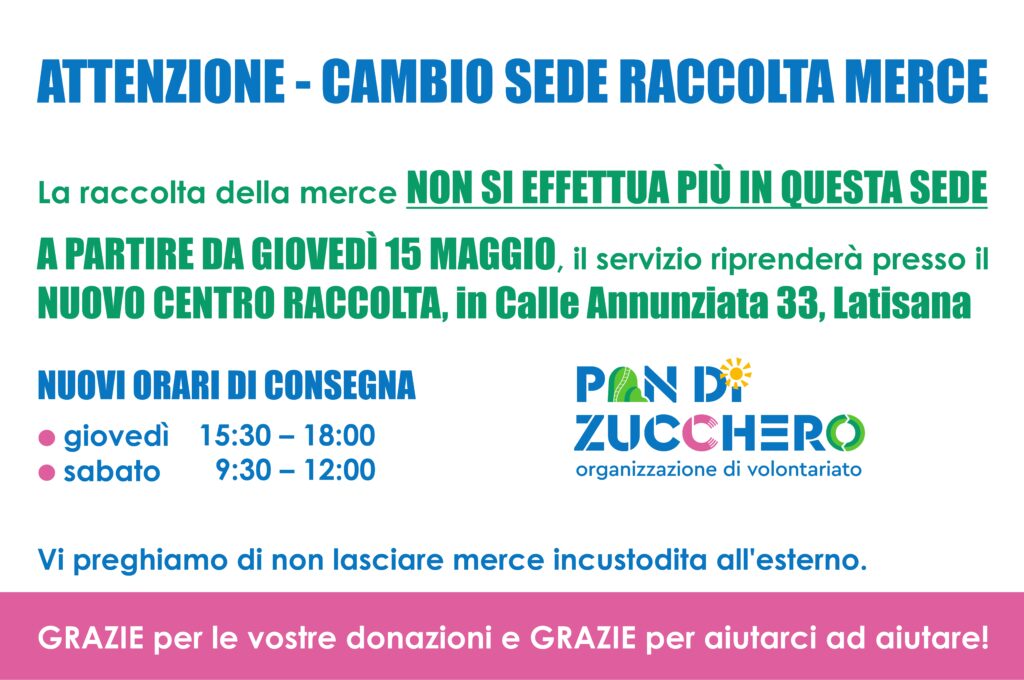 Cambio sede RACCOLTA MERCE Cambio sede RACCOLTA MERCE ATTENZIONE: CAMBIO SEDE RACCOLTA MERCEVi informiamo che sabato 12 aprile 2025 sarà l’ultimo giorno di raccolta nella sede di Viale della Stazione. A partire da giovedì 15 maggio, la raccolta riprenderà nella nuova sede in Calle dell’Annunziata 33, Latisana (UD). Nuovi orari di consegna:• Giovedì dalle 15:30 alle 18:00• Sabato dalle 09:30 alle 12:00Vi preghiamo di non lasciare merce incustodita all’esterno. Grazie per aiutarci ad aiutare!